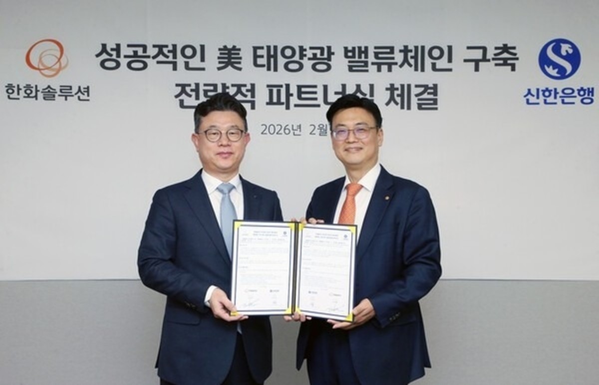 지난 6일 한화솔루션은 서울 중구 본사에서 신한은행과 미국 태양광 개발 및 북미 신재생에너지 밸류체인 구축을 위한 금융 협력 업무협약을 체결했습니다. 협약식에는 장호식 신한은행 CIB그룹장과 정원영 한화솔루션 재무실장이 참석했습니다.