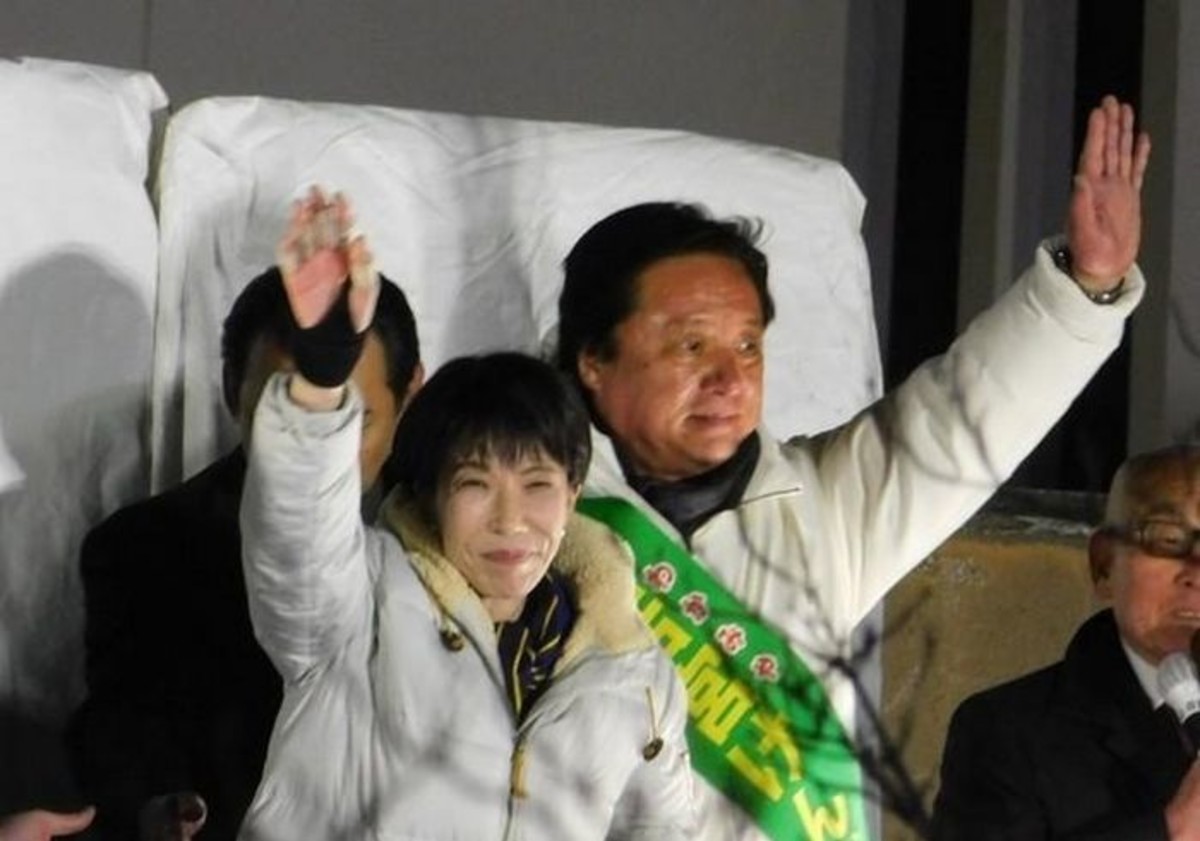청중의 목소리에 손을 흔드는 다카이치 사나에 총리(왼쪽)와 와카미야 켄지 후보/ デイリースポーツonline