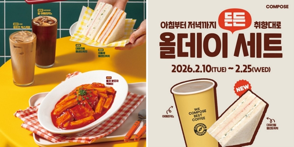 컴포즈커피는 신메뉴 출시를 기념해 2월 10일부터 25일까지 '올데이 세트' 2종 할인 프로모션을 운영합니다.