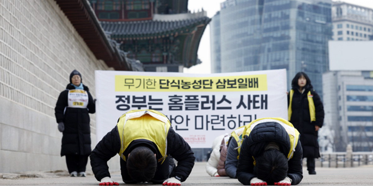 민주노총 서비스연맹 마트노조 홈플러스지부가 홈플러스 사태에 대한 정부의 대책 마련을 촉구하며 청와대를 향해 삼보일배를 진행합니다.