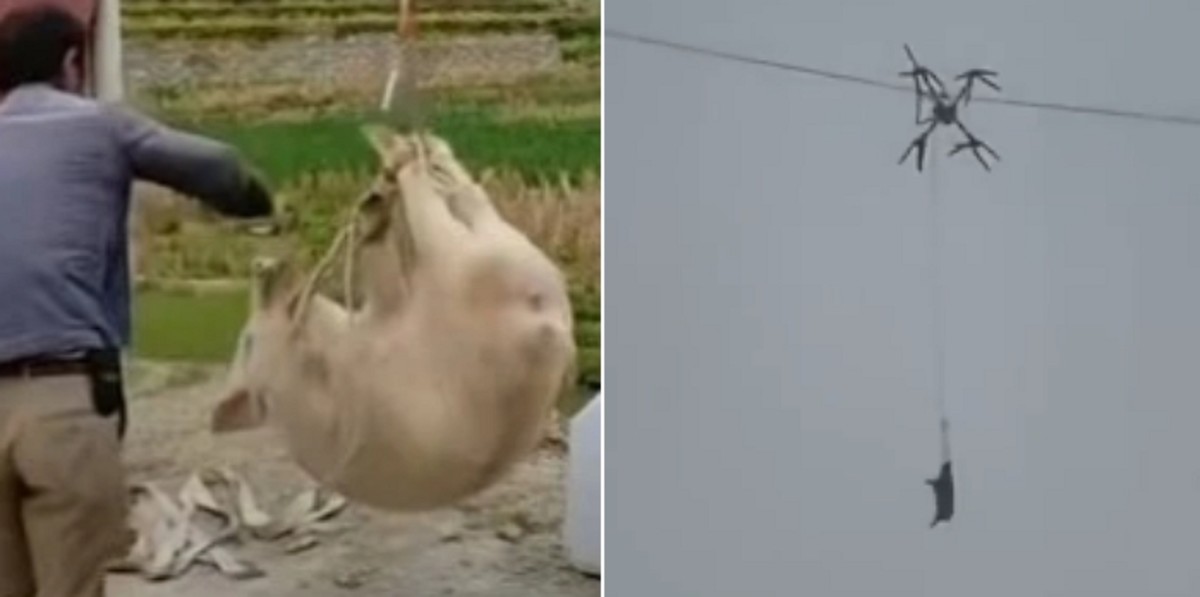 현장을 지켜본 주민들이 SNS에 올린 영상과 사진에는 회색빛 하늘을 배경으로 드론에 매달린 돼지가 전선에 걸려 있는 기이한 장면이 포착됐습니다. 이 특이한 광경을 구경하기 위해 수많은 사람들이 현장으로 몰려들었습니다.
