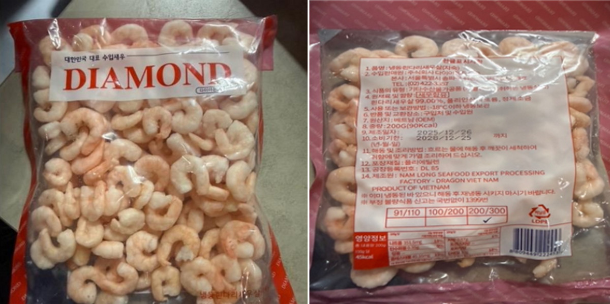 문제가 된 제품은 서울 송파구에 위치한 수입식품 판매업체 '다이아몬드새우'에서 수입·판매한 '냉동흰다리새우살'입니다.