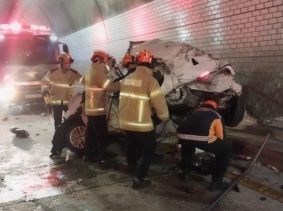 충돌의 충격으로 모닝 차량은 우측 터널 벽면에 부딪힌 후 전복되었습니다.