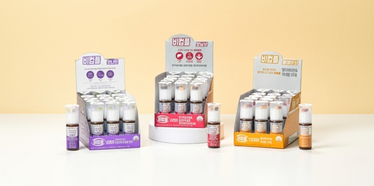 비컴플 제품군은 '모닝샷', '올데이샷', '굿나잇' 3종으로 구성되어 있으며, 각각 아침, 낮, 밤 시간대에 필요한 영양소와 기능성 성분을 집중 배합했습니다. 특히 정제와 액상을 하나의 용기에 담은 듀얼 제형을 도입해 물 없이도 간편하게 섭취할 수 있어 휴대성과 편의성을 크게 향상시켰습니다.