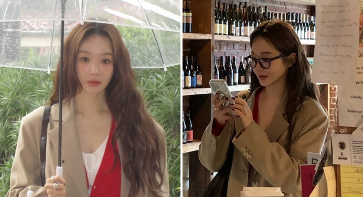 공개된 이미지에서 그는 가죽 소재의 미니스커트와 빨간색 카디건을 조합한 후 트렌치코트를 매치해 세련된 캐주얼 룩을 선보였습니다.