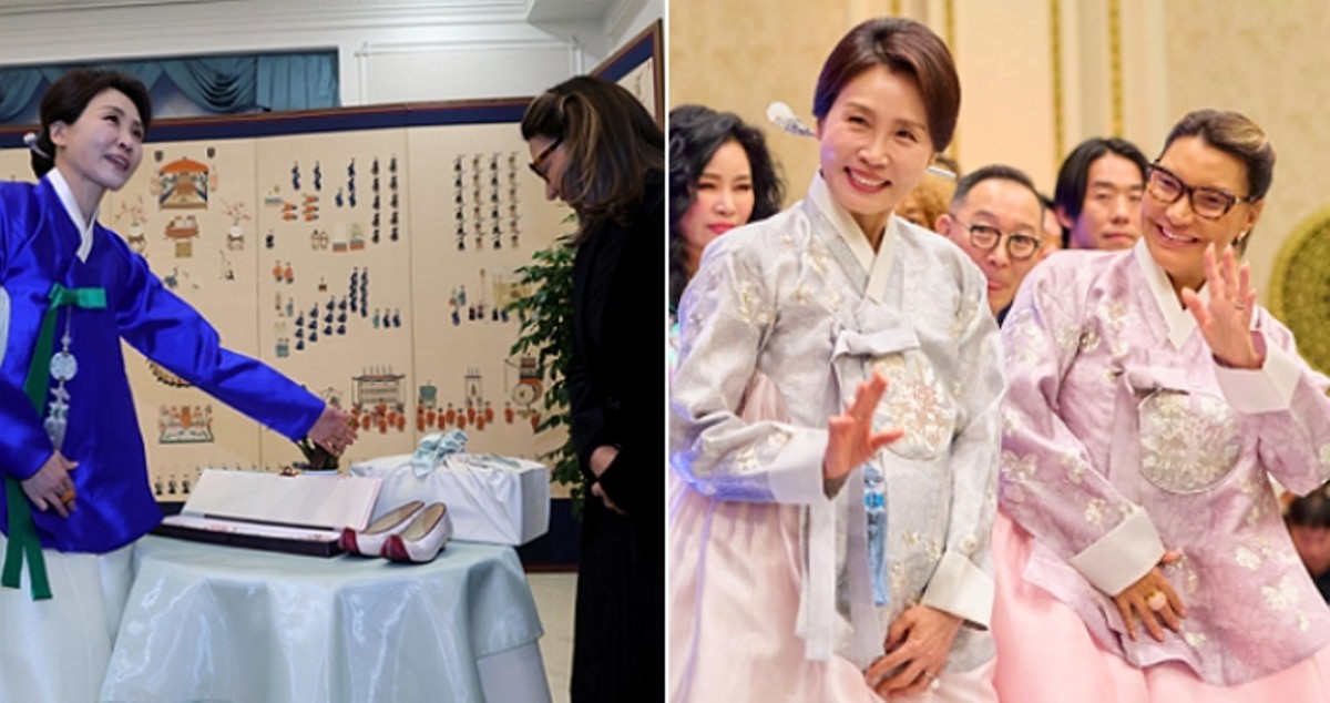 두 여사는 방명록 서명과 기념 촬영을 마친 후 환담장 옆 별도 전시 공간으로 이동했습니다. 전시 공간에는 지난 21일 서울 종로구 광장시장 내 맞춤 한복 가게에서 함께 선택한 한복과 장신구, 선물들이 진열되어 있었습니다.