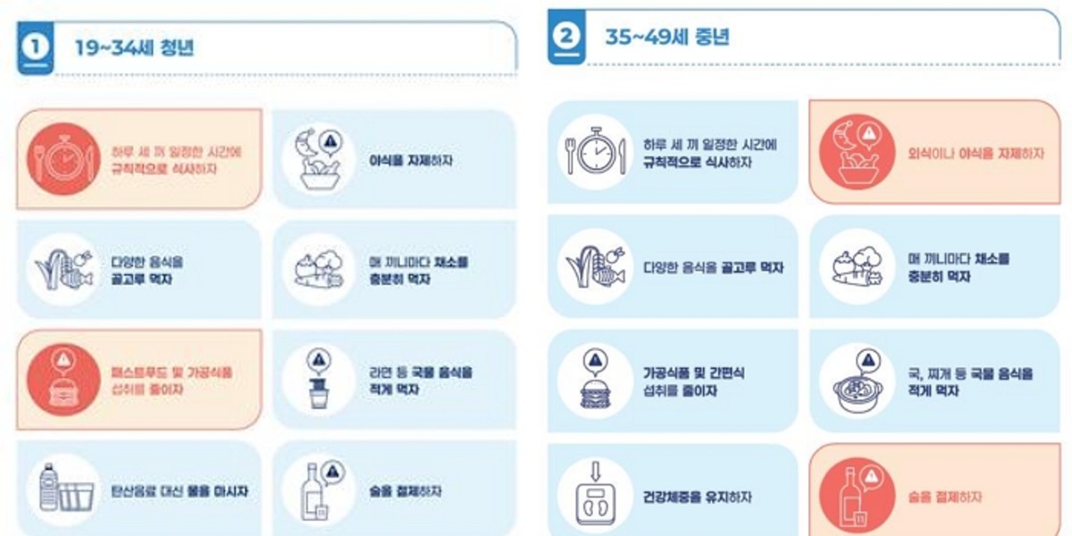 청년층(19~34세)에게는 야식, 패스트푸드, 라면 섭취를 줄이고 탄산음료 대신 물을 마실 것을 권장합니다. 중년층(35~49세)에게는 외식과 야식을 자제하고 음주를 절제할 것을 권고했습니다.