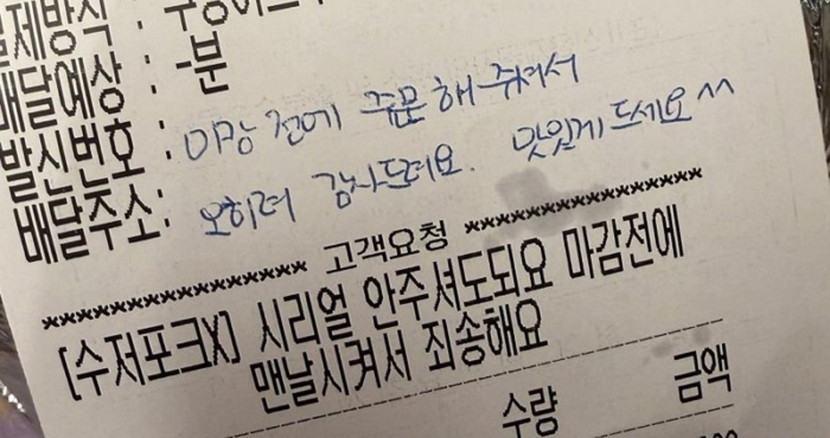 지난 23일 온라인 커뮤니티에 '마감 전에 주문한 손님'이라는 제목으로 배달 영수증 사진이 게시됐습니다.