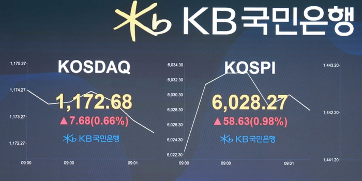 코스피가 장 시작과 함께 6000선을 돌파한 25일 오전 서울 영등포구 KB국민은행 딜링룸 전광판에 증시 시황이 표시되고 있다 / KB국민은행