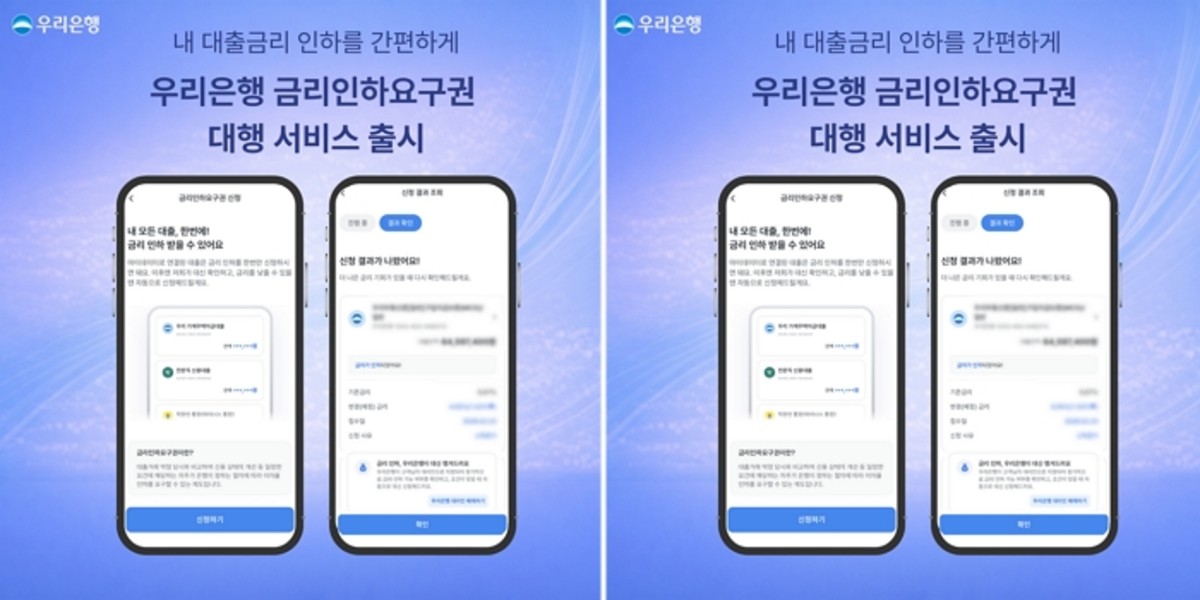 고객들은 우리WON뱅킹 앱의 자산·소비 메뉴에서 자산, 대출 순으로 접근해 '금리인하요구권 대행 서비스' 배너를 통해 이용할 수 있습니다.
