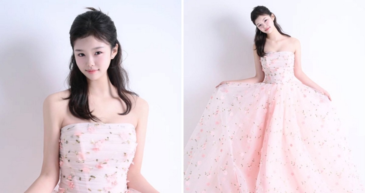어깨를 드러내는 튜브톱 스타일과 볼륨감 있는 스커트를 완벽하게 소화한 설아의 모습은 중학교 1학년 학생이라고 믿기 어려울 정도로 성숙한 분위기를 연출했습니다.