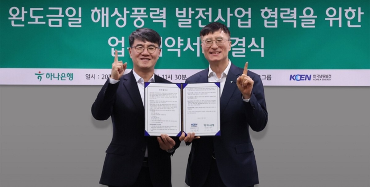 하나은행과 한국남동발전이 전라남도 완도군 금일읍 해상에 대규모 해상풍력단지 조성을 위한 협력에 나섰습니다. 양 기관은 26일 600MW 규모의 '완도금일해상풍력 발전사업' 추진을 위한 업무협약을 체결했다고 발표했습니다.