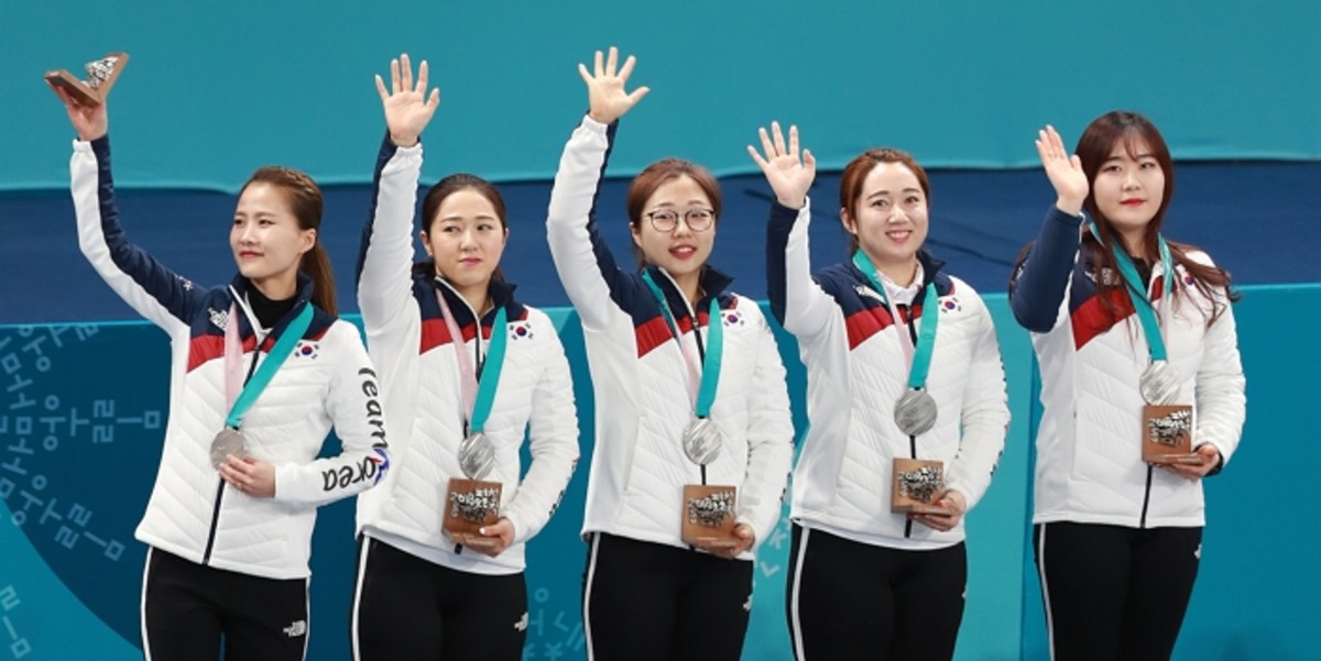 대한민국 여자 컬링 대표팀(김은정, 김경애, 김선영, 김영미, 김초희)이 강원도 강릉컬링센터에서 열린 2018평창 동계올림픽 컬링 여자 결승전 스웨덴과의 경기를 마친 후 시상식에서 손을 흔들고 있다.2018.2.25/뉴스1