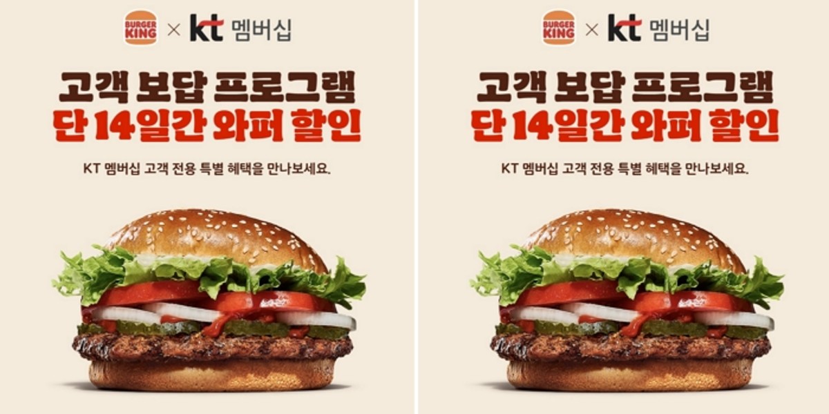 버거킹이 KT 멤버십 고객 대상, '와퍼'를 3,000원에 제공하는 'KT 고객 보답' 프로모션을 지난 3일부터 오는 16일까지 2주 간 진행합니다.