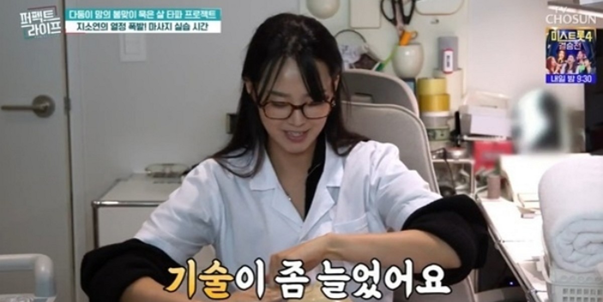 퇴근 후에도 지소연은 전용 공부방에서 피부관리사 자격증 실습에 매진했습니다. 그는 "제가 피부관리사 자격증 준비 중이라서 실습을 하고 있습니다"라고 밝혔습니다.