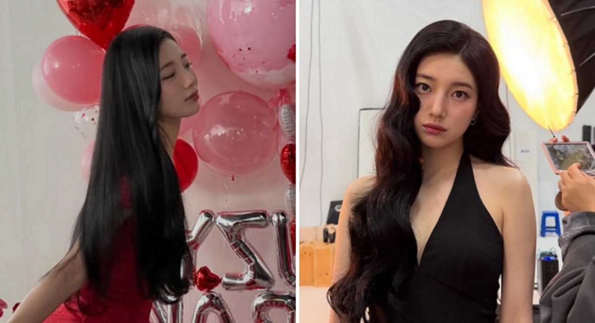 또 다른 사진에서는 붉은 원피스를 착용하고 컬을 조금 더 차분하게 연출한 수지의 모습이 담겨 있습니다. 이 룩에서 수지는 청순하고 우아한 분위기를 연출하며 데뷔 초 신선한 충격을 안겼던 그때의 느낌을 재현했습니다.