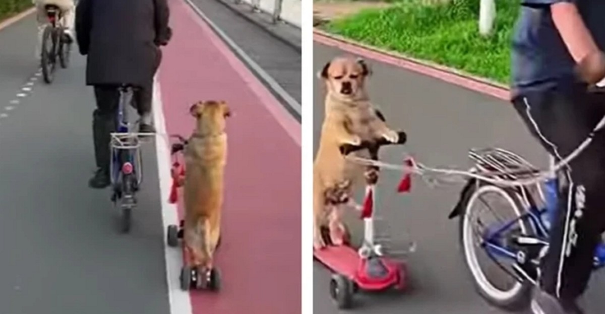 할아버지가 자전거를 타는 속도에 맞춰 강아지 역시 킥보드를 타고 길을 따라 쭉 달리며 완벽한 호흡을 보여주었습니다.