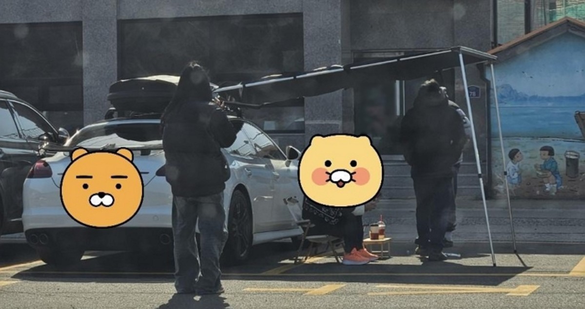 이들은 12시에 문을 여는 식당의 영업 시작을 기다리며 다른 차량이 이용해야 할 주차 공간을 개인 휴게소처럼 사용했다.