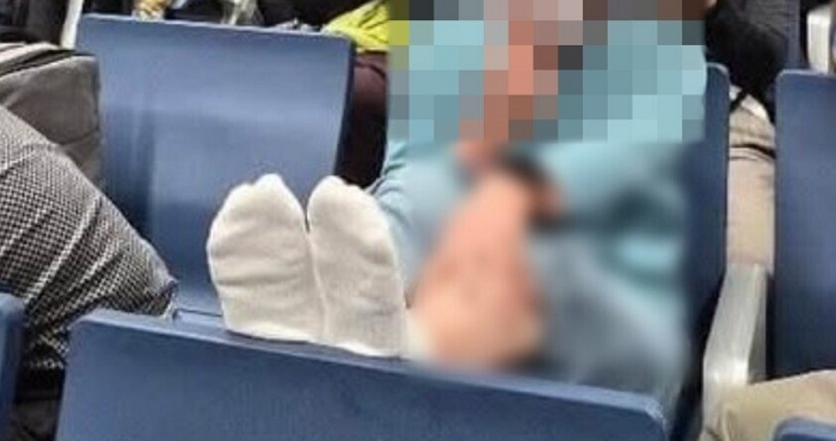 해당 남성은 공항 의자에 앉은 상태에서 맨발로 앞좌석에 발을 걸쳐놓고 있었다.