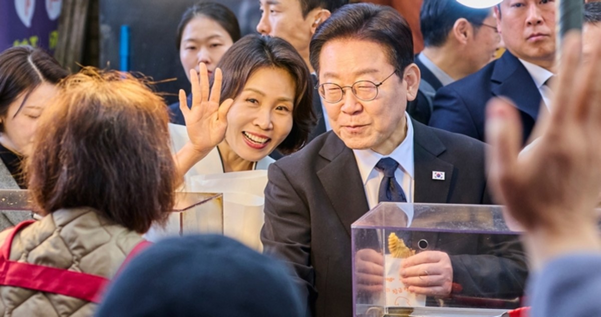 이재명 대통령과 김혜경 여사가 15일 창원 반송시장을 찾아 시민들과 인사를 나누고 있다. / 뉴스1(청와대 제공)