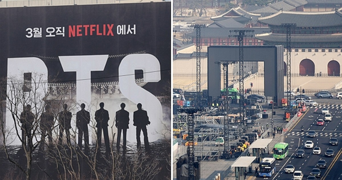 지난 17일 공연을 사흘 앞둔 광화문광장 주변에서는 대규모 무대 설치 작업과 도로 통제가 진행되고 있었다. 현장 곳곳에서 BTS 컴백을 알리는 대형 랩핑 광고들이 설치됐다.