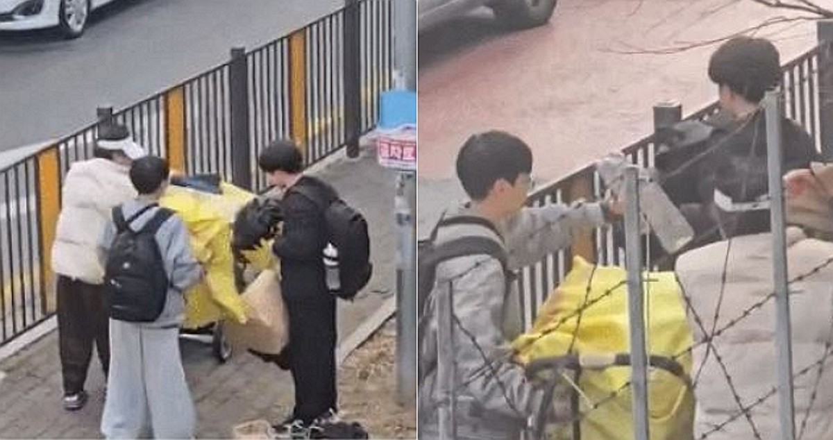 제보자가 촬영한 영상에는 가방을 멘 학생 2명이 인도에서 할머니의 손수레 주변에 떨어진 재활용품을 정리하는 장면이 담겼다.