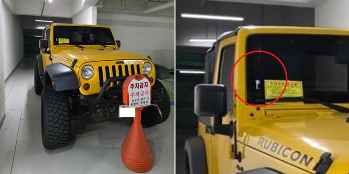공개된 사진에 따르면 노란색 지프 랭글러 루비콘 차량은 주차금지 표지에도 아랑곳하지 않고 주차장 통로에 차량을 세워놨다.