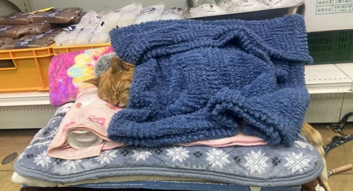 일본의 한 전통 식료품점 마스코트인 '귀여운 점박이 치즈 고양이'가 근무 시간 중 대놓고 낮잠을 자다 손님에게 딱 걸려 화제다.