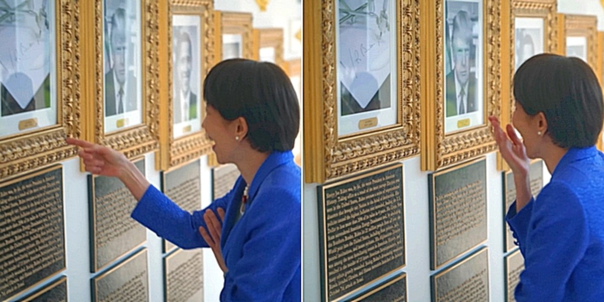 지난 20일 백악관이 유튜브에 공개한 영상에서 다카이치 총리는 역대 미국 대통령들의 사진이 걸린 백악관 내부를 둘러보던 중 제45대 트럼프 대통령의 1기 집권 당시 사진을 보며 감탄하는 표정을 지었다. 이어 두 손을 들어 보이는 모습을 보였다.