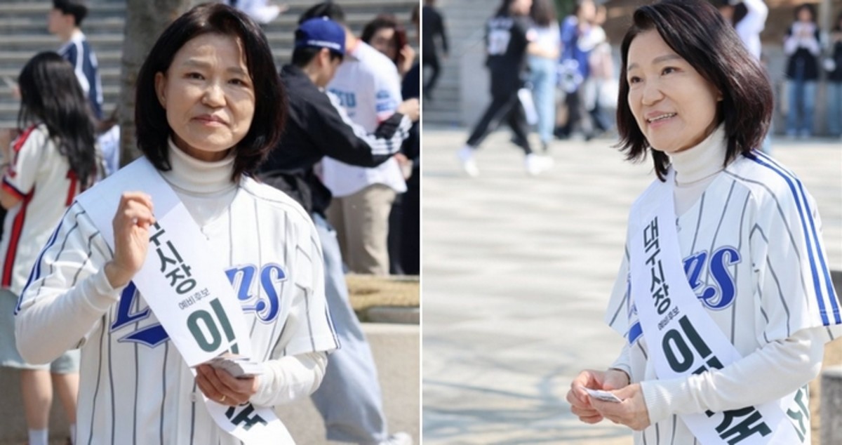 사진 속 이 전 위원장은 삼성 라이온즈 흰 유니폼을 입고 '대구시장 예비후보 이진숙'이라고 적힌 흰색 어깨띠를 두르고 있었다.