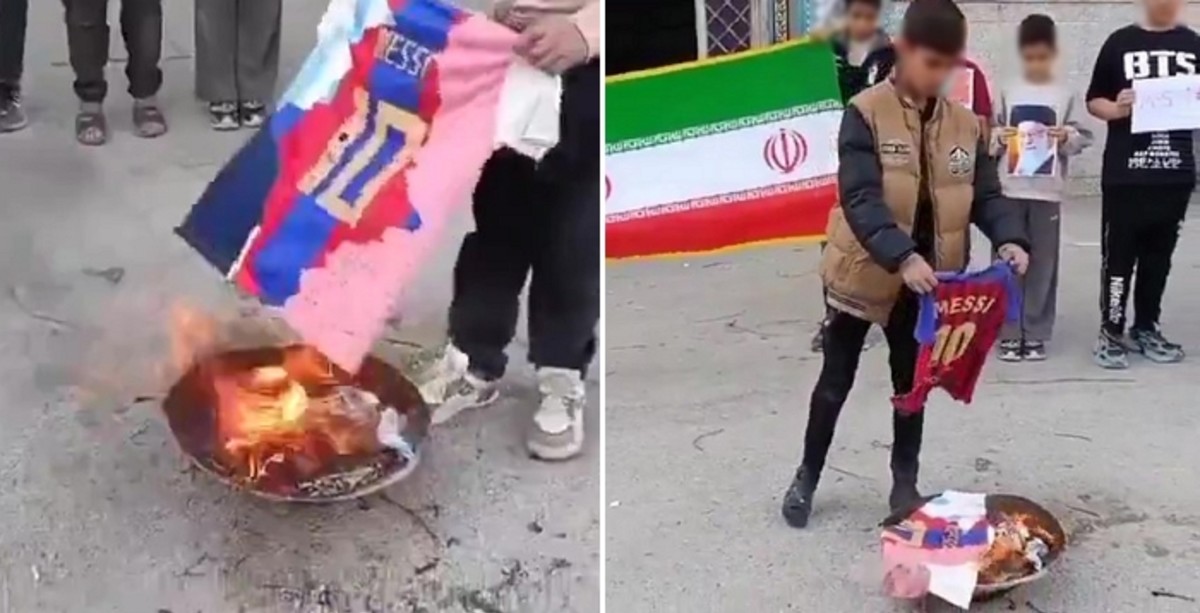 SNS에 올라온 이란 아이들이 메시 유니폼을 불 태우고 있는 모습. / 엑스(X)