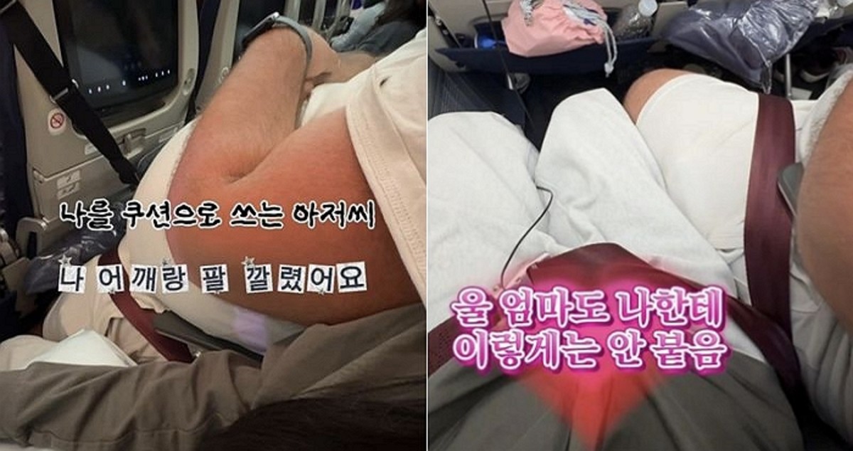 영상을 올린 여성은 13시간 장거리 비행 중 옆자리 거구 남성 승객으로 인한 불편함을 토로했다.