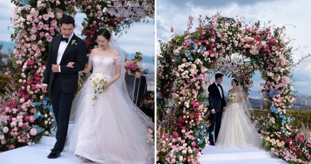공개된 사진에는 화려한 장미꽃이 만개한 버진로드를 배경으로 나란히 걷는 두 사람의 모습이 담겼다.