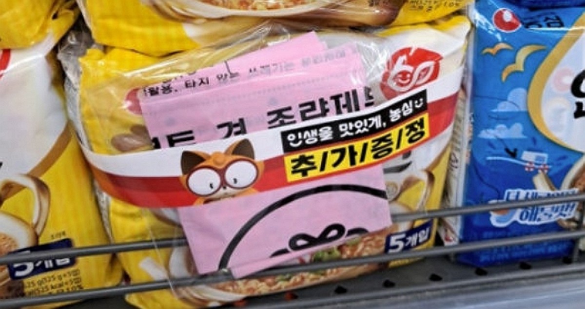 사진에는 한 마트에 진열된 라면 5개입 번들 상품에 쓰레기 종량제 봉투가 함께 묶여 있는 모습이 담겼다.