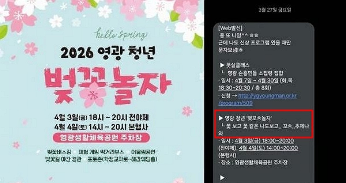 전남 영광군 청년센터가 벚꽃축제 홍보 문자에서 성적 의미로 해석될 수 있는 표현을 사용해 논란에 휩싸였다.