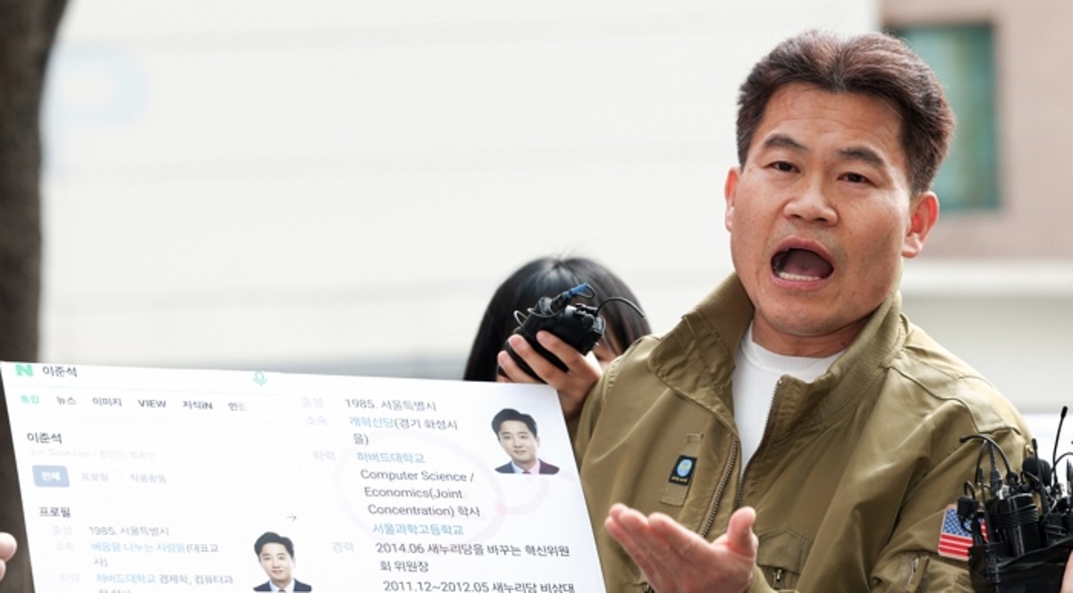 유튜버 전한길씨가 1일 오전 서울 동작경찰서에서 세번째 조사를 받기 위해 출석하며 이준석 개혁신당 대표의 학력이 허위사실이라고 주장하고 있다. 2026.4.1/뉴스1