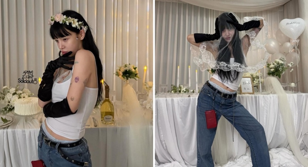공개된 사진에는 브라이덜 샤워 파티 현장에서 신부처럼 꾸민 지민의 모습이 담겼다. 지민은 머리에 베일을 쓴 채 언더웨어 라인이 그대로 노출되는 파격적인 패션을 매치해 독특한 분위기를 연출했다. 일반적인 신부의 청순한 모습 대신 본인만의 자유분방하고 장난기 가득한 개성을 드러냈다.