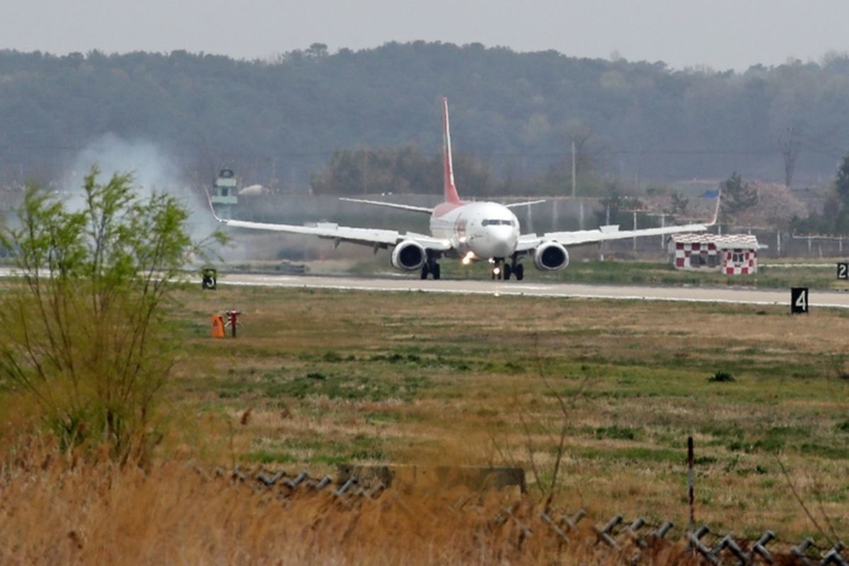 광주 군 공항 이전 문제 해결을 위한 국무총리실 주관 범정부 협의체가 출범하는 가운데 2일 오후 광주공항에서 여객기가 착륙하고 있다.2021.4.2 / 뉴스1