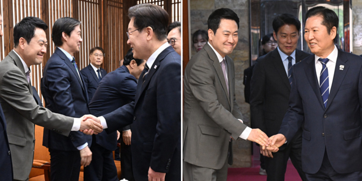 이 대통령은 이날 26조2천억원 규모의 '전쟁 추경' 시정연설에 앞서 국회의장 접견실에서 우원식 국회의장과 여야 지도부를 만났다.