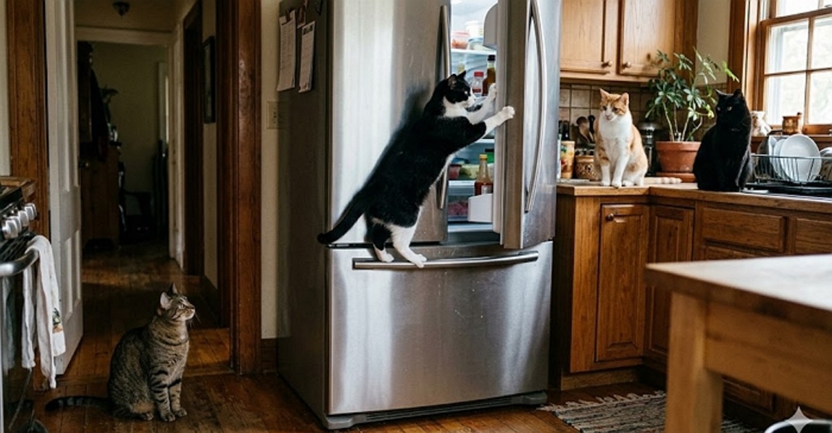 냉장고 속 생고기가 사라지는 범인을 잡기 위해 설치한 카메라에 고양이들이 협력하여 냉장고 문을 열고 음식을 훔치려던 영리한 모습이 포착됐다.