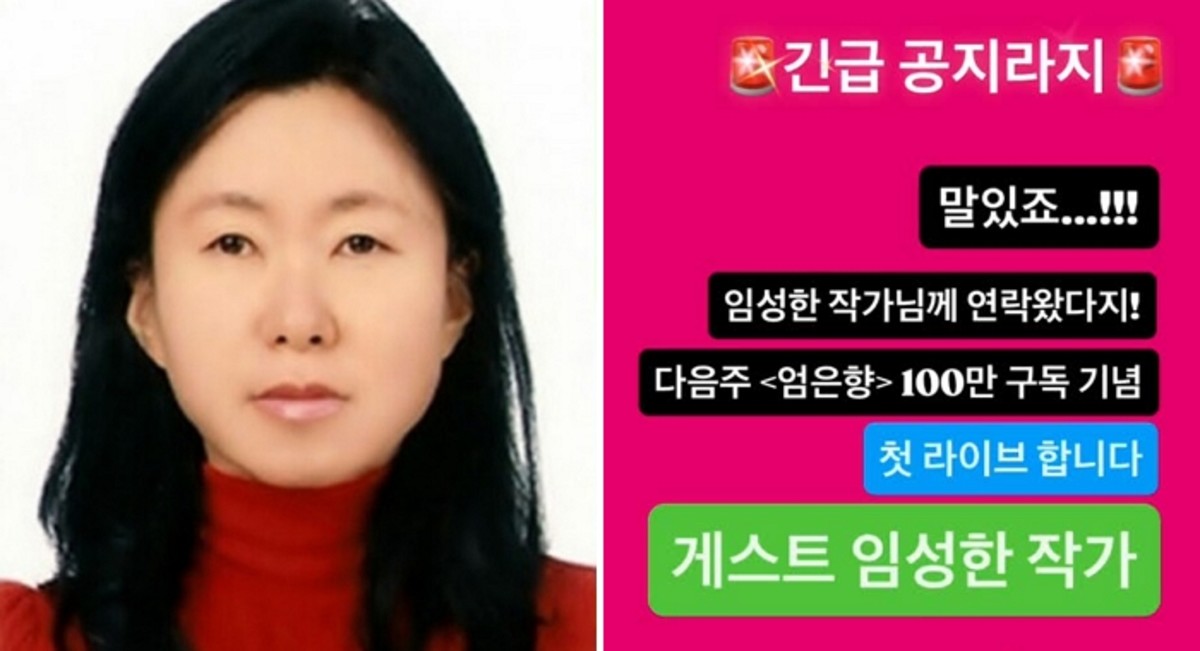 크리에이터 엄은향은 7일 자신의 SNS 계정을 통해 "임성한 작가님께 연락 왔다. 다음 주 엄은향 100만 구독 기념 첫 라이브 한다"고 전하며 파격적인 소식을 알렸다. 엄은향은 "게스트 임성한 작가다. 주작 아니고 진짜"라고 강조하며 이번 출연이 사실임을 거듭 확인했다.