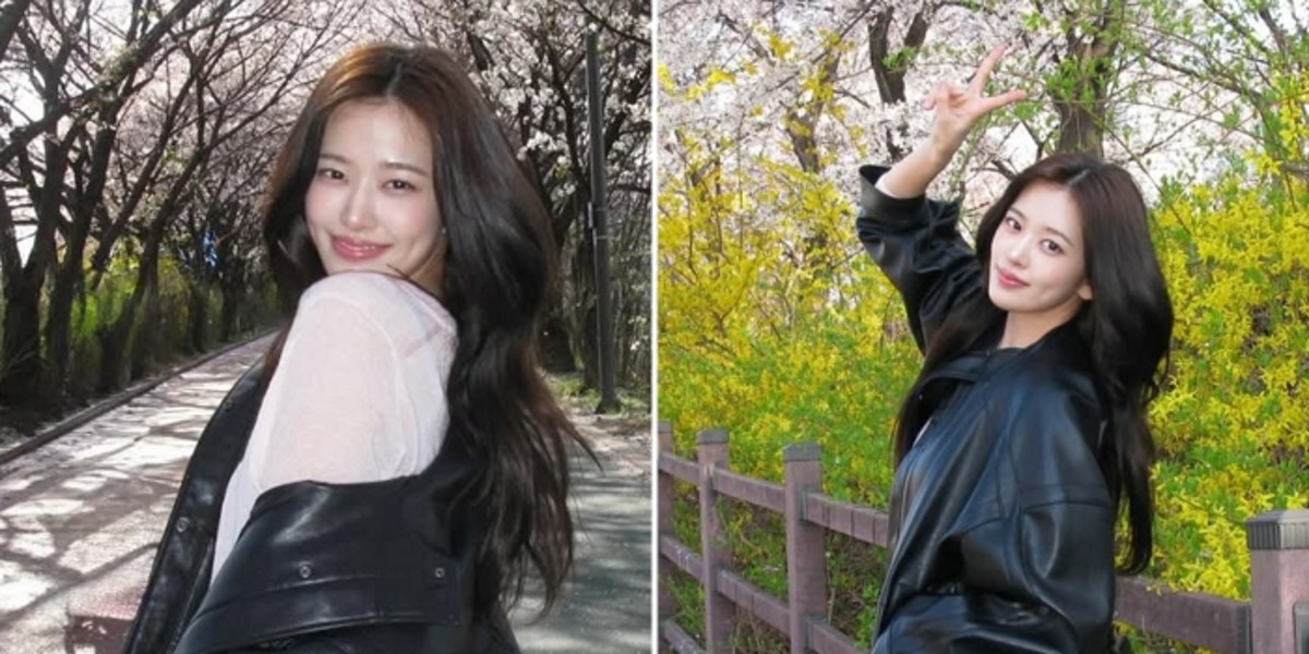 사진 속 안유진은 벚꽃이 만개한 나무 아래서 여유를 만끽하고 있다. 화이트 티셔츠에 데님 팬츠를 입고 블랙 가죽 재킷을 걸친 차림으로 세련된 '꾸안꾸' 패션을 완벽하게 소화했다.