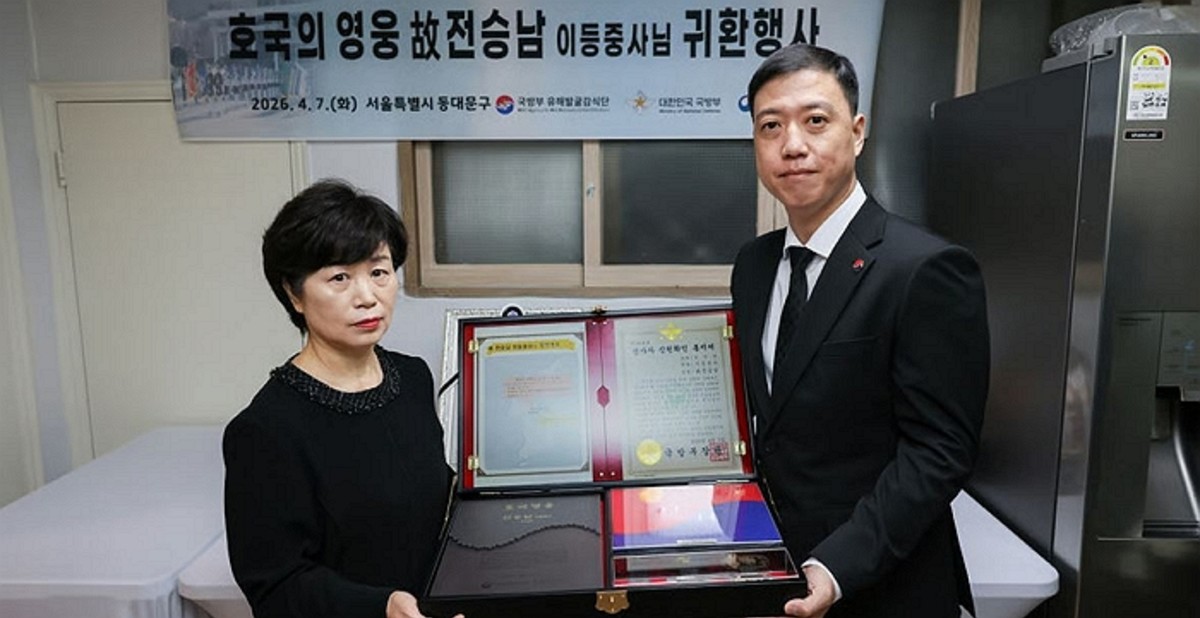 김성환 국방부유해발굴감식단 직무대리(육군 중령)와 故 전승남 이등중사의 친조카 전명숙 씨 (국방부 제공. 재판매 및 DB 금지) 2026.4.7 / 뉴스1