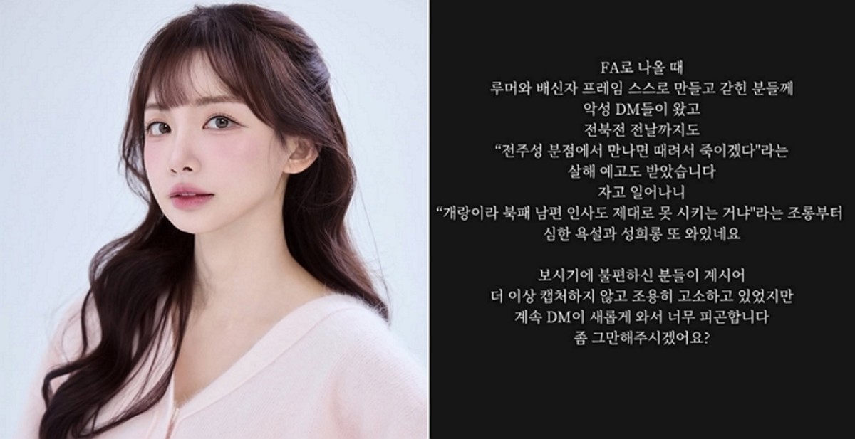 곽민선은 "자고 일어나니 '개랑이라 북패 남편 인사도 제대로 못 시키는 거냐'라는 조롱부터 심한 욕설과 성희롱이 또 와 있다"고 상황을 설명했다.