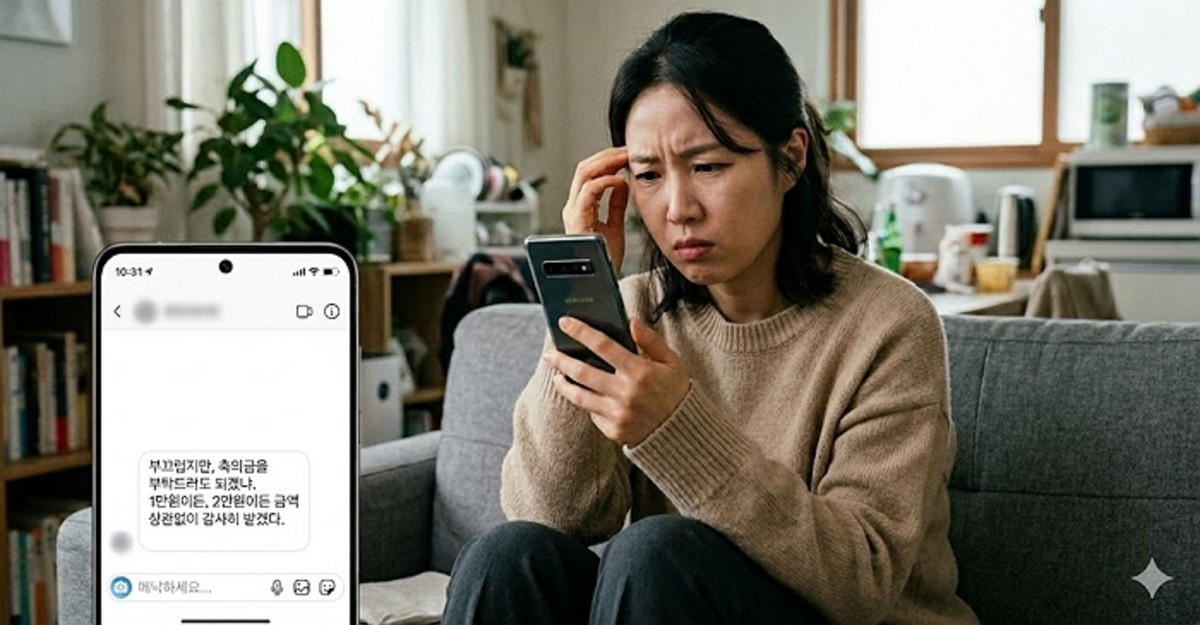 그런데 메시지는 여기서 끝나지 않았다. 발신자는 "부끄럽지만, 축의금을 부탁드려도 되겠냐. 1만원이든, 2만원이든 금액 상관없이 감사히 받겠다"며 직접적으로 축의금을 요구했다.