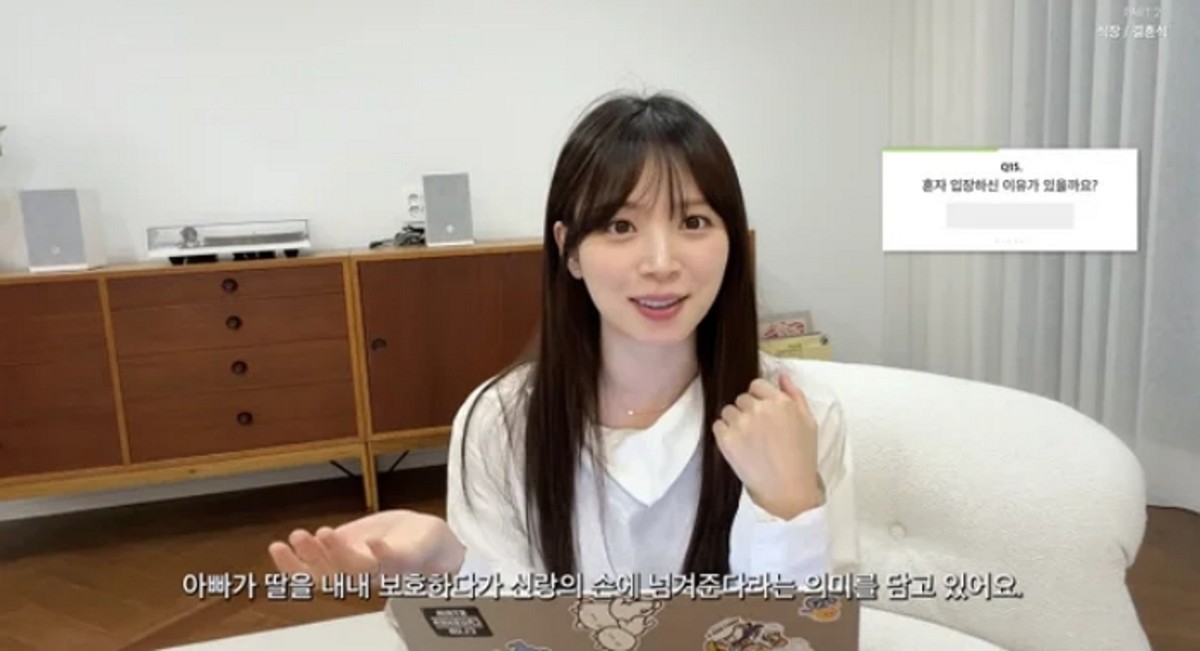 그는 "보통 아버지가 딸과 함께 입장하는 건 딸을 보호하다 신랑에게 넘겨준다는 의미라고 하더라. 그런데 나는 성인이 된 이후 부모님의 경제적 지원 없이 독립적으로 살아오려고 노력해왔기 때문에 그 의미가 크게 와닿지 않았다"고 고백했다. 이어 "그건 제 개인적인 생각이자 신념이었다"며 "아버지께서도 '네가 하고 싶은 대로 하라'며 흔쾌히 존중해주셨다"고 덧붙였다.