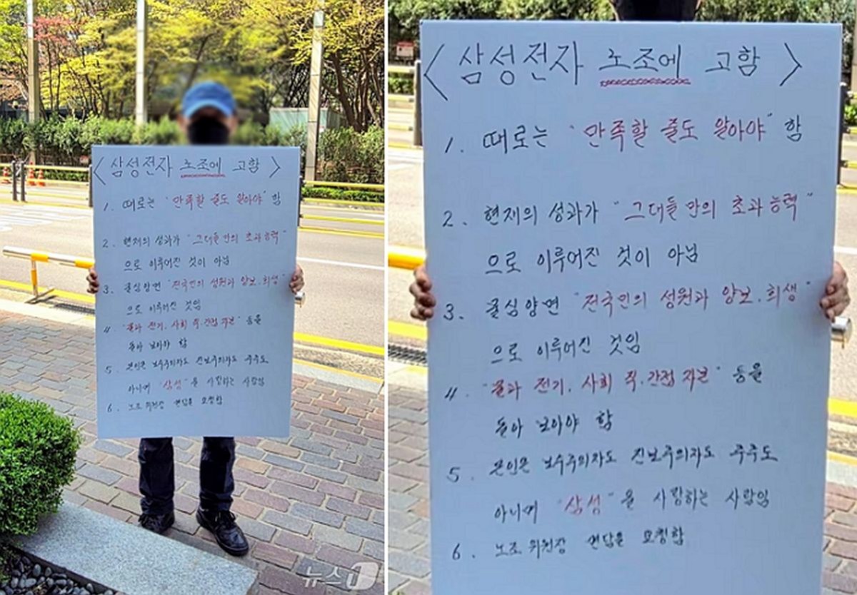 지난 15일 업계에 따르면 자신을 '삼성을 사랑하는 사람'이라고 소개한 60대 남성 박 모 씨는 이날 오전 삼성전자 서초사옥 앞에서 노조를 비판하는 1인 피켓 시위를 진행했다.