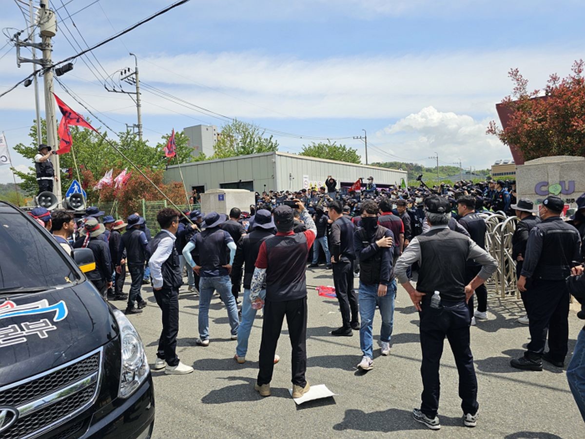 사고는 탑차가 이동하던 중 일부 조합원들이 차량 앞으로 나서면서 발생한 것으로 알려졌다. 현장에서는 경찰과 노조 간 몸싸움이 벌어지며 대치 상황이 이어지고 있다.