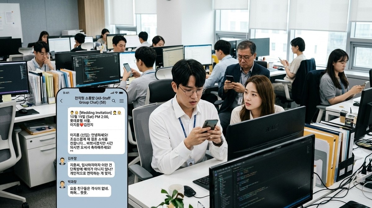 사건의 발단은 입사 5개월 차인 신입 사원이 전 사원 150명이 참여한 공지 채널에 자신의 모바일 청첩장을 전격 공개하면서 시작됐다.
