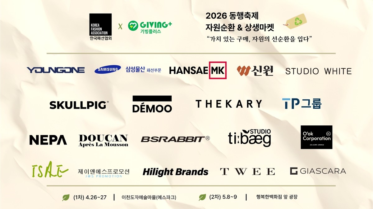 한국패션협회(회장 성래은)가 ESG 플랫폼 기빙플러스와 손잡고 오는 26일부터 '자원순환 & 상생 마켓'을 열어 2026 동행축제에 참여한다고 24일 발표했다.